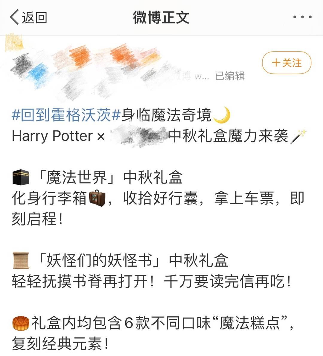 除去非要用方形“月饼”标榜创新的商家,还有不少商家在中秋节推出联名中秋礼盒,有与饮料合作的,有与咖啡品牌合作的,也有与插画师、电影IP合作的。其中,就包括了某品牌与“哈利波特”IP的联名。